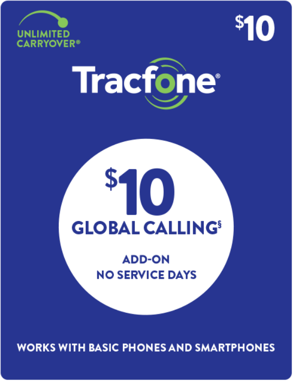 §The $10 Global Calling Card must be combined with another Tracfone Service Plan to work. International long distance service is available to select destinations only, which are subject to change at any time. Calls must originate from the US or Puerto Rico only. No international roaming allowed. Only for personal use. Calls are billed in one-minute increments. Airtime minutes will be deducted plus the cost of the International call. Rates are subject to change without prior notice. Card benefits expire after 180 days of last use or 30 days after your service is suspended, whichever occurs first.